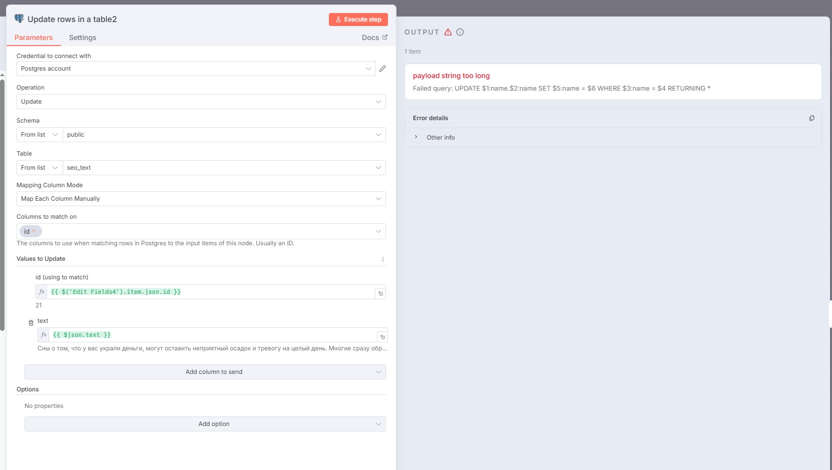 Если при обновлении данных в PostgreSQL у тебя в n8n вылетает ошибкаpayload string too long